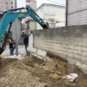代表の秋好です。 西宮の戸建解体現場も無事に工事完了しました。 ご近所の皆様には騒音、工事車両の通行でご迷惑をお掛けしました。 お隣さんのブロック塀が古く危険な状態なのでついでに解体して欲しいとのこと 続けてブロック解体工事の流れになりました。 10cmブロック9段、控え壁はあるもののクラックが多く危険な状態 ブロックの端をカッター切りして重機で一気に倒します。 通行車両、人、作業員…