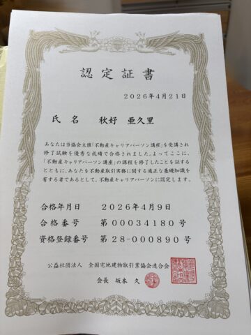 不動産キャリアパーソンに認定されました