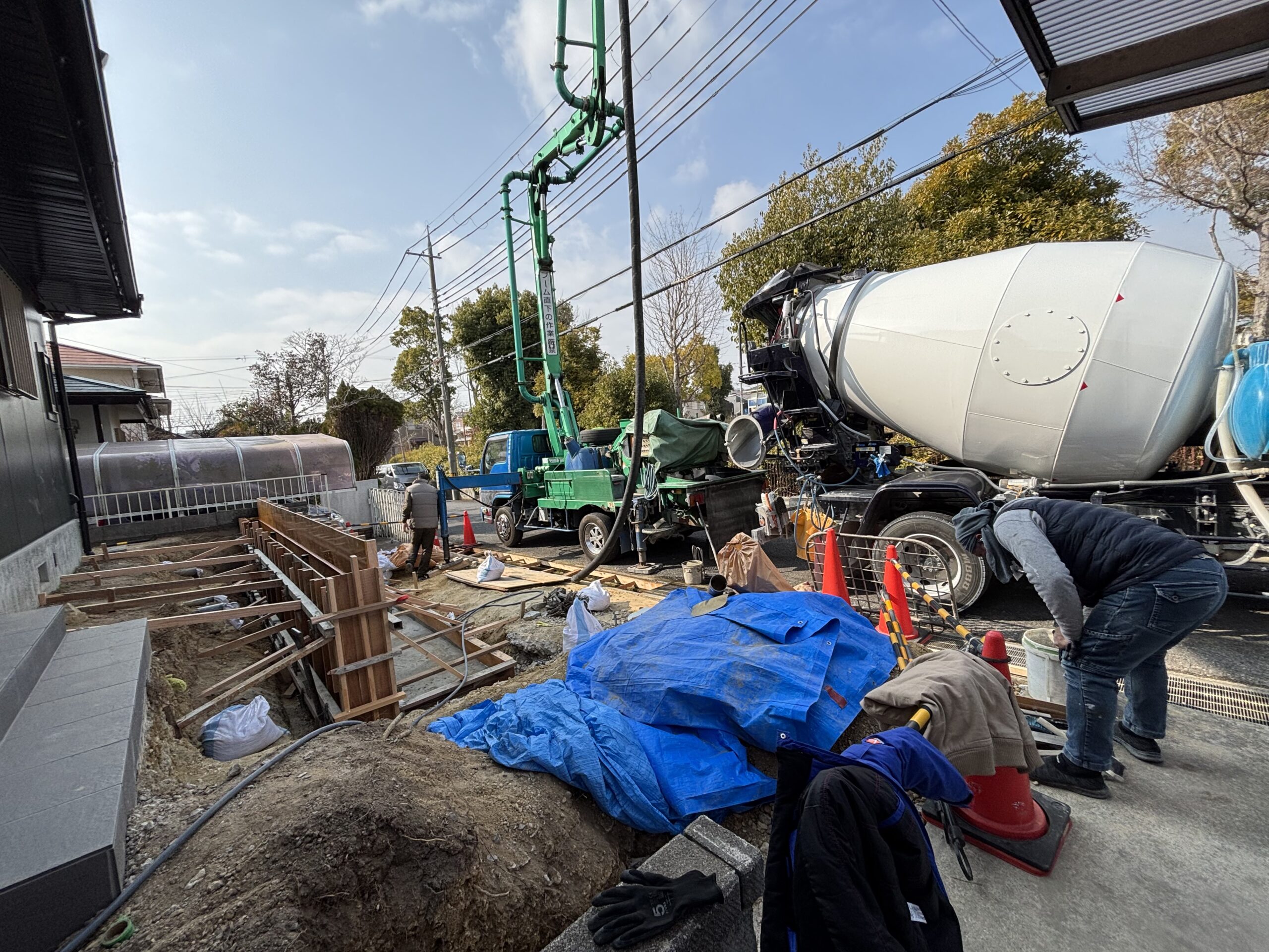 擁壁の型枠が完了し、いよいよ打設。ポンプ車も呼んで…