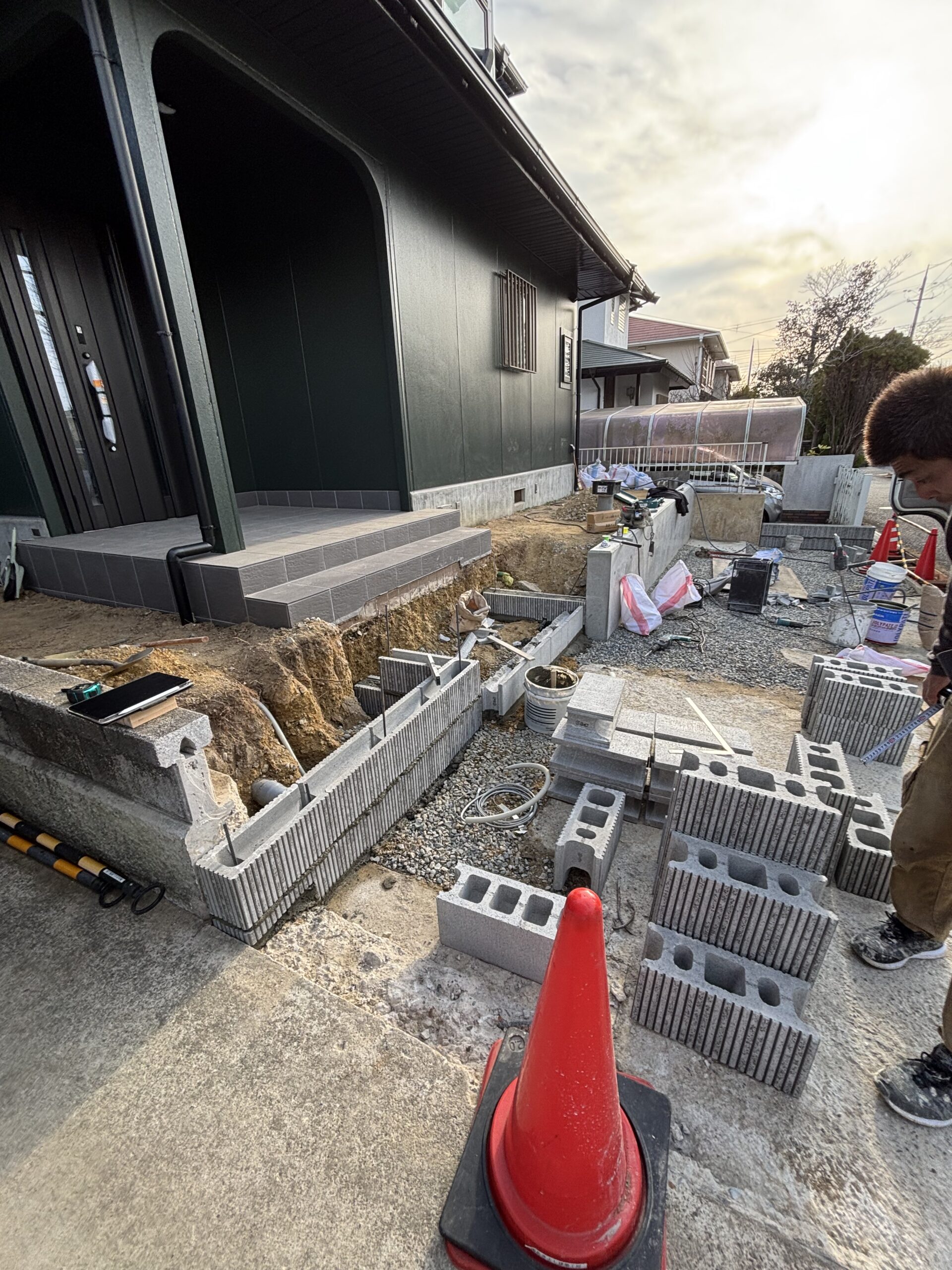 その後重機も入って埋め戻し。階段と擁壁のブロックを作っていきます。