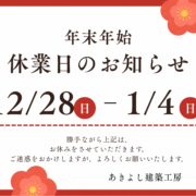 あけましておめでとうございます。 昨年はご愛顧を賜り誠にありがとうございました。 今年も皆様のお力になれるよう、スタッフ一同誠心誠意頑張ってまいります!どうぞよろしくお願いいたします。 皆様にとって素晴らしい1年となりますように! 2025年 元旦 株式会社あきよし建築工房